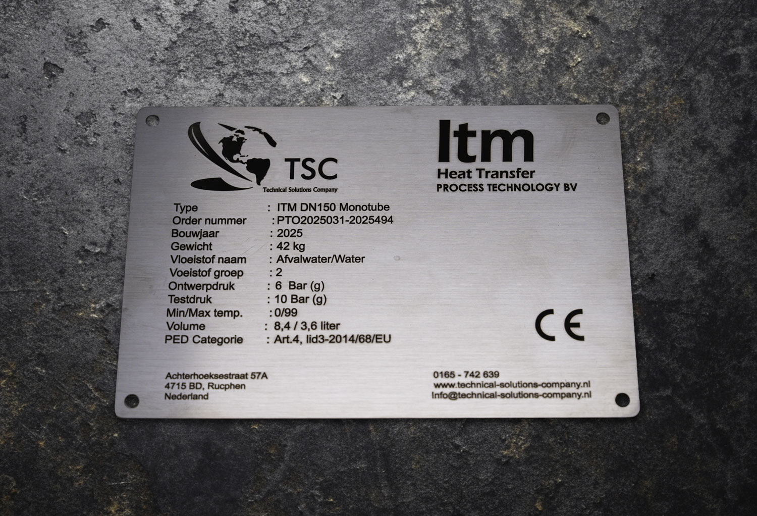 Op schepen en maritieme installaties worden typeplaten blootgesteld aan zout water, UV-straling en extreme temperatuurverschillen. Hier is een geëtste typeplaat van zeewaterbestendig RVS 316 de standaard. Essentieel voor keuring en registratie.